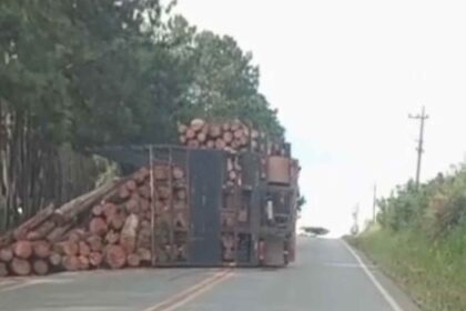 Um caminhão que transportava toras de madeira tombou na tarde desta sexta-feira…